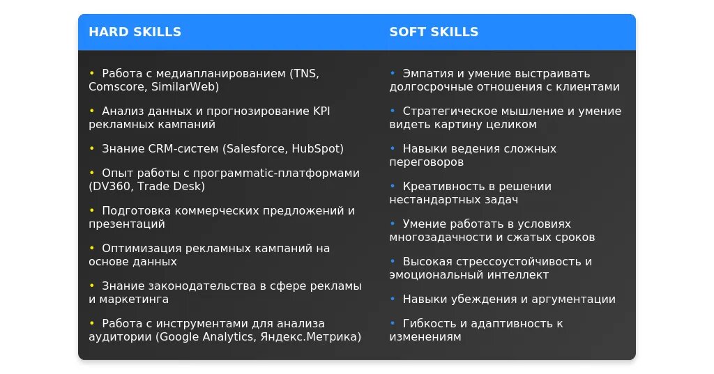 После адаптации: "Навыки работы с платформами Google Ads и Facebook Ads, ведение переговоров, увеличение продаж."