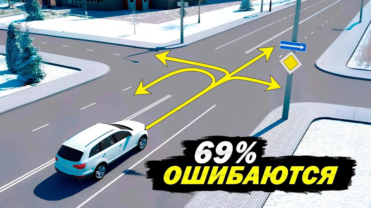 Всем привет, уважаемые автолюбители! Мы продолжаем цикл разборов интересных дорожных ситуаций. Сегодня разберём задачу, которая будет полезна как новичкам за рулём, так и опытным водителям, которые хотят освежить свои знания. Как показал предварительный опрос, 69% голосовавших выбрали неправильный вариант ответа. Предварительные опросы я провожу в своём Telegram-канале, там регулярно выходят новые и, главное, оригинальные задачи на тему ПДД. Подписывайтесь и решайте задачи вместе! А в данной задаче необходимо выяснить, Куда разрешено продолжить движение белому внедорожнику? На выбор даны следующие варианты ответа: Правильный ответ вы найдете после разбора задачи, но не спешите в него подглядывать. Попробуйте самостоятельно решить задачу, а лишь потом сверяйтесь с правильным ответом. На картинке с заданием мы видим белый внедорожник у перекрёстка, через который ему смоделировали четыре пути для дальнейшего движения. Для того чтобы определить разрешённые пути, нужно детальнее разобрать к