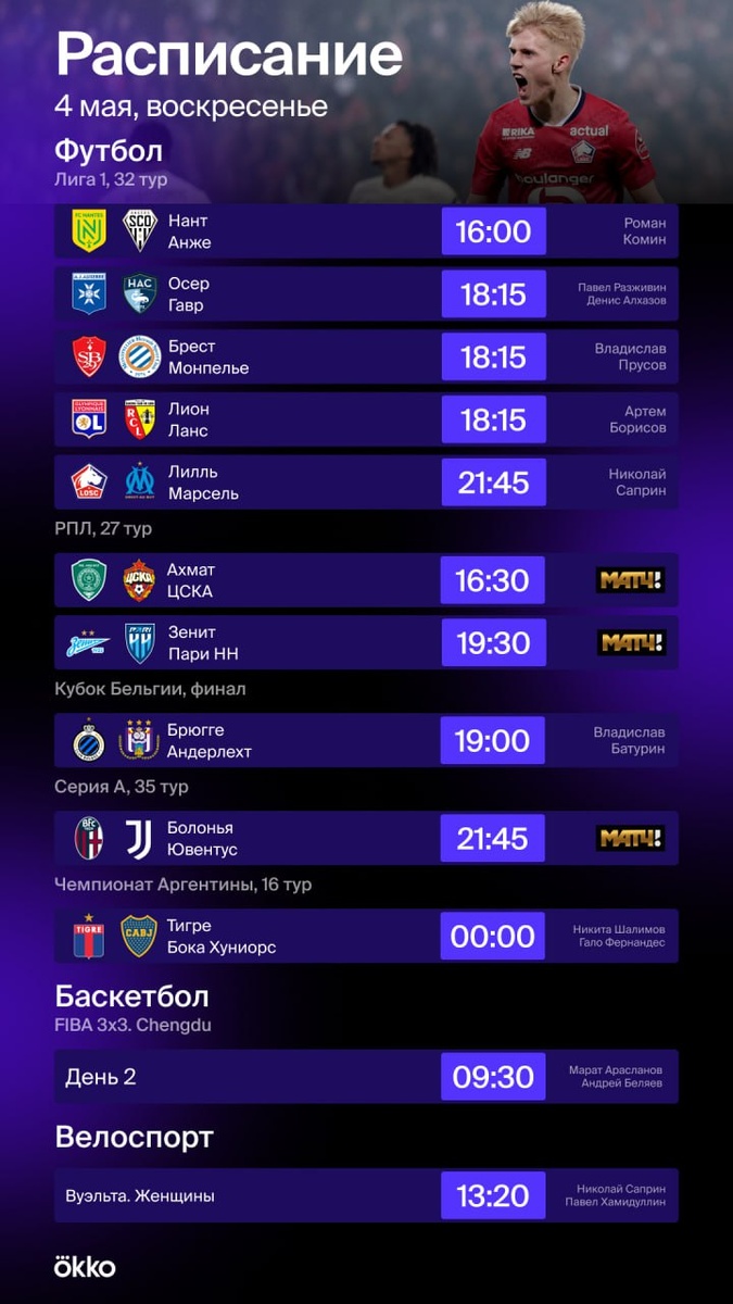 🤩 Насыщенное спортивное воскресенье! В эфире будет много футбола: Лига 1, РПЛ, Серия А, Аргентина и даже финал Кубка Бельгии. Не забудем и про баскетбол с велоспортом. Включай все трансляции в Okko: okko.tv/s/4ot 💜