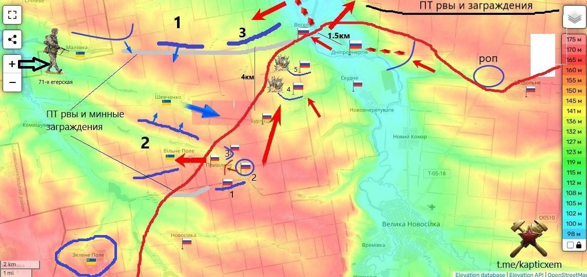 Северо-западнее Великой Новоселки ВКС России ФАБ-500 размягчают оборону противника в н.п.Зеленое поле. Разносят лесополосу, прикрывающую поселок с севера и опорники примыкающие к трассе В.Новоселка-Гуляй Поле. схемы и карты