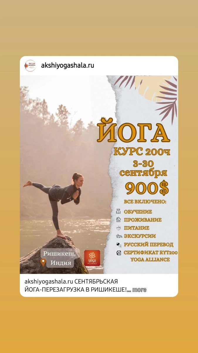 СЕНТЯБРЬСКАЯ ЙОГА-ПЕРЕЗАГРУЗКА В РИШИКЕШЕ! 3 – 30 сентября. Ты с нами? Пока все ломают голову: «Где бы отдохнуть осенью?», ты можешь сделать гениальный ход — подарить себе 4 недели настоящей йогической перезагрузки на берегу Ганги! Что тебя ждет: – ежедневные практики йоги (асаны, пранаяма, медитация) – древние знания от учителей Гималайской традиции – освежающие дала нети (да-да, нос скажет спасибо) – философия, анатомия, смех, слезы и просветление (возможно) – и, конечно, чай с видом на Гималаи Жилье: – 900$ — двухместное размещение (бонус: сосед, который станет другом) – 1050$ — одноместное размещение (бонус: тишина, дзен и личное пространство) Ты не обязана быть супер-гибкой, не обязана быть "йогиней со стажем", не обязана вообще ничего — кроме как приехать с открытым сердцем. Мы научим, поддержим и, возможно, даже рассмешим до слёз! Йога-курс 200 часов в Ришикеше. Сертификация международного уровня. После курса — ты преподаватель, готовый дарить свет другим (или хотя бы друзь
