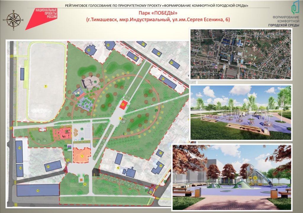 Стартовало всероссийское голосование за объекты благоустройства. Россияне выбирают, какими будут их города. В том числе и тимашевцы, которые получили возможность выбрать один из трех проектов благоустройства города, о которых мы ниже рассказываем. Проголосовать за понравившийся объект благоустройства можно до 12 июня на официальном сайте https://pos.gosuslugi.ru/lkp/fkgs/home/. Парк «Победы» мкр. Индустриальный, ул. им. Сергея Есенина, 6 Обустройство детской и спортивной площадки Устройство скейт-парка Установка светильников, скамеек и урн Устройство новых дорожек Установка малых архитектурных форм Улица Братьев Степановых Устройство асфальтобетонной обочины и парковок Установка дорожных бордюров Установка светильников, скамеек, урн и малых архитектурных форм Обустройство детской площадки и тренажеров Улица Ленина от ул. Братьев Степановых до ул. Комарова Обустройство детской площадки Установка светильников, скамеек и урн Устройство новых дорожек с покрытием из тротуарной плитки Устано