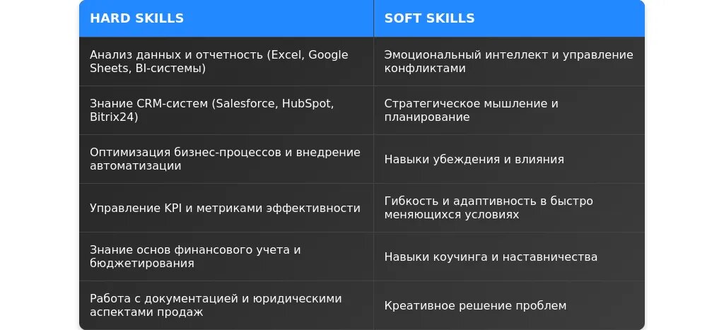 - Технические навыки: CRM-системы (Salesforce, HubSpot), аналитика данных (Excel, Power BI). - Личные качества: Лидерство, коммуникабельность, стрессоустойчивость. - Управление: Планирование продаж, управление командой, бюджетирование.
