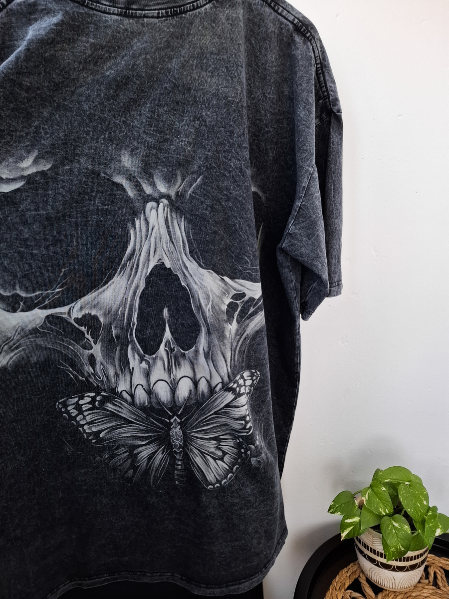 Этот красавчик вчера доехал до заказчика, а значит, его можно показать. Футболка 4XL, соответственно, череп на ней пришлось рисовать размером с упитанную собаку, не меньше, что само по себе наложило отпечаток на мою нервную систему. Плюс полутона и надо было сохранить прозрачность местами. Но он получился таким красивым, что я все ему прощаю. И потраченный день, и желание бросить всё и стать подзаборным наркоманом, которое посещало меня регулярно, пока я не закончила