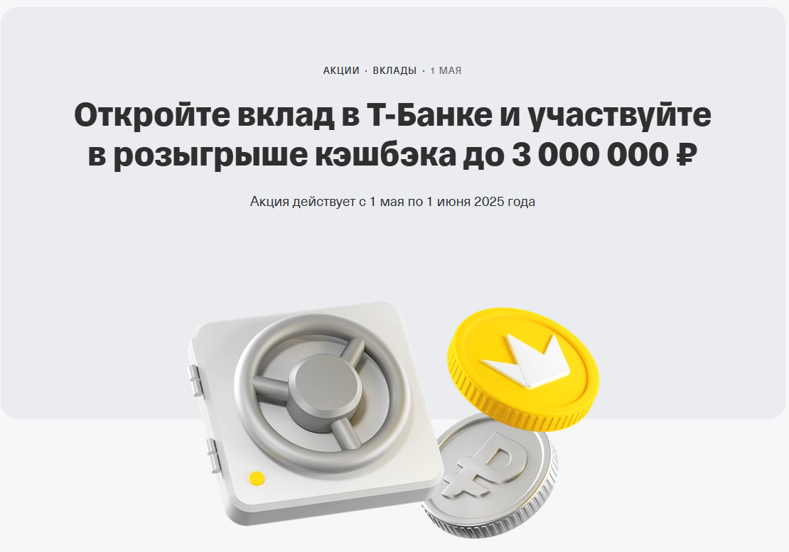 Суть акции: среди тех, кто откроет вклад с 1 мая по 1 июня и не будет выводить деньги до 10 июня, разыграют кешбэк до 100% за покупки, совершенные с 1 июля по 31 декабря 2025 года.