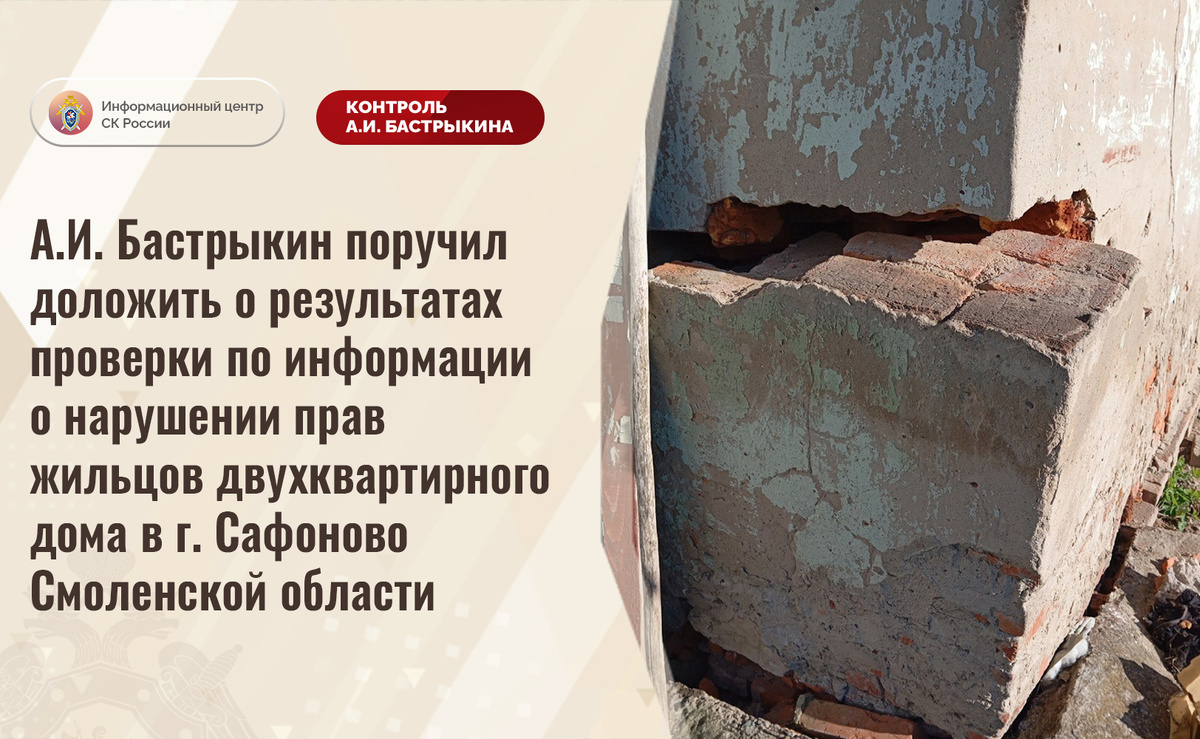А.И. Бастрыкин поручил доложить о результатах проверки по информации о нарушении прав жильцов двухквартирного дома в г. Сафоново Смоленской области В социальной сети сообщается о ненадлежащем обслуживании и длительном непризнании аварийным двухквартирного жилого дома по улице Пушкина в городе Сафоново Смоленской области. Здание барачного типа, 1977 года постройки, находится в непригодном для проживания состоянии, потолочные перекрытия, несущие конструкции и фундамент разрушаются. Обращения жильцов результатов не принесли, в признании дома аварийным отказано, ремонтные работы также не проводятся, в связи с чем граждане вынуждены проживать в небезопасных условиях. В СУ СК России по Смоленской области по данному факту организована процессуальная проверка. Председатель Следственного комитета Российской Федерации Александр Иванович Бастрыкин поручил и.о. руководителя СУ СК России по Смоленской области Андрею Сергеевичу Киселеву доложить о предварительных и окончательных результатах процесс