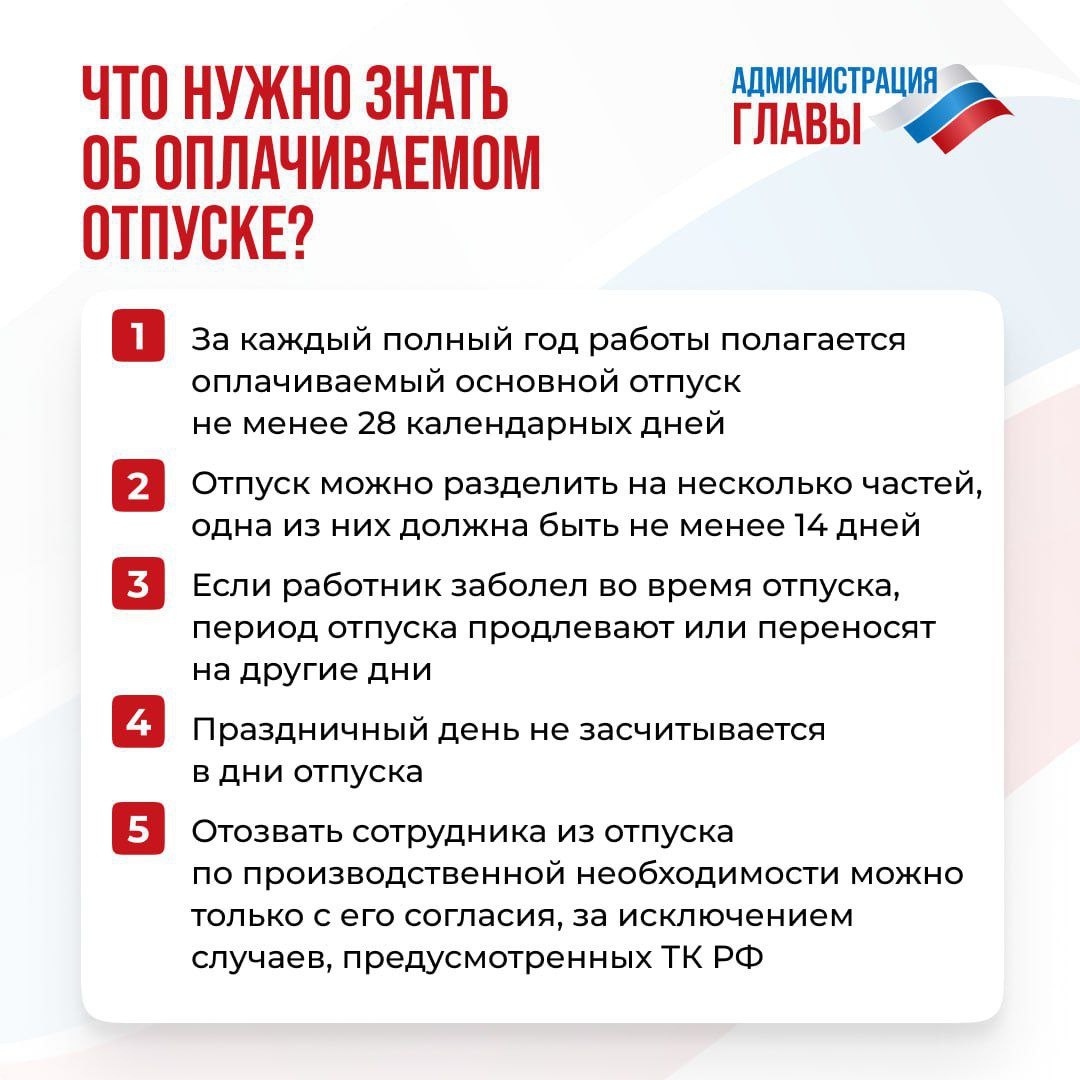 Каждому сотруднику, согласно Трудовому кодексу РФ, полагается ежегодный оплачиваемый отпуск. Что о нем нужно знать, рассказали в карточках. Источник: @AG_DPR