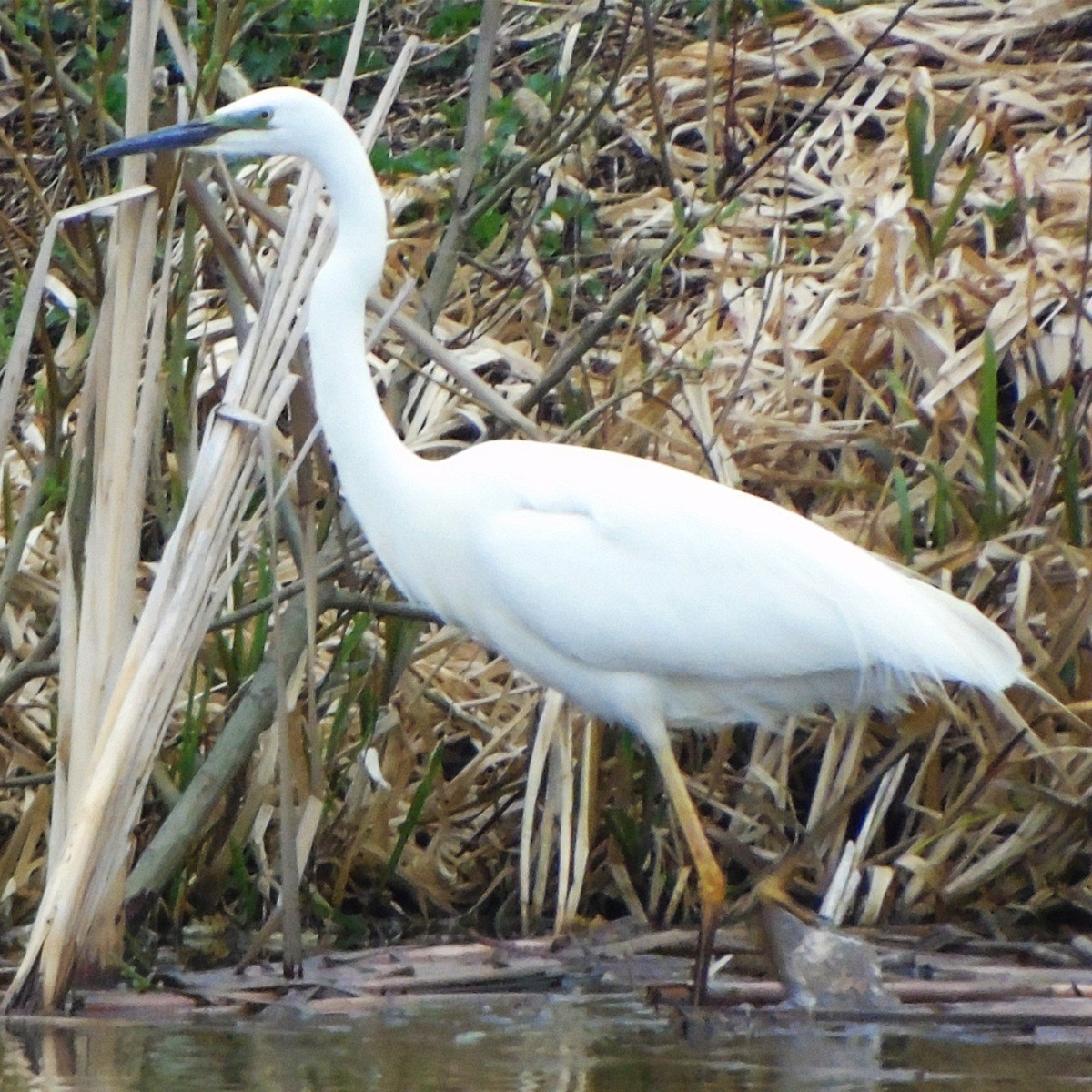 Большая белая цапля охотится, одновременно поглядывая на меня и на рыбаков на берегу