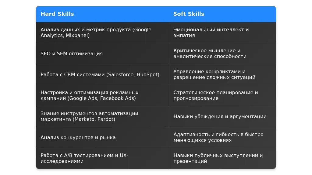 - Акцент на навыки: аналитика, работа с инструментами, создание контента.