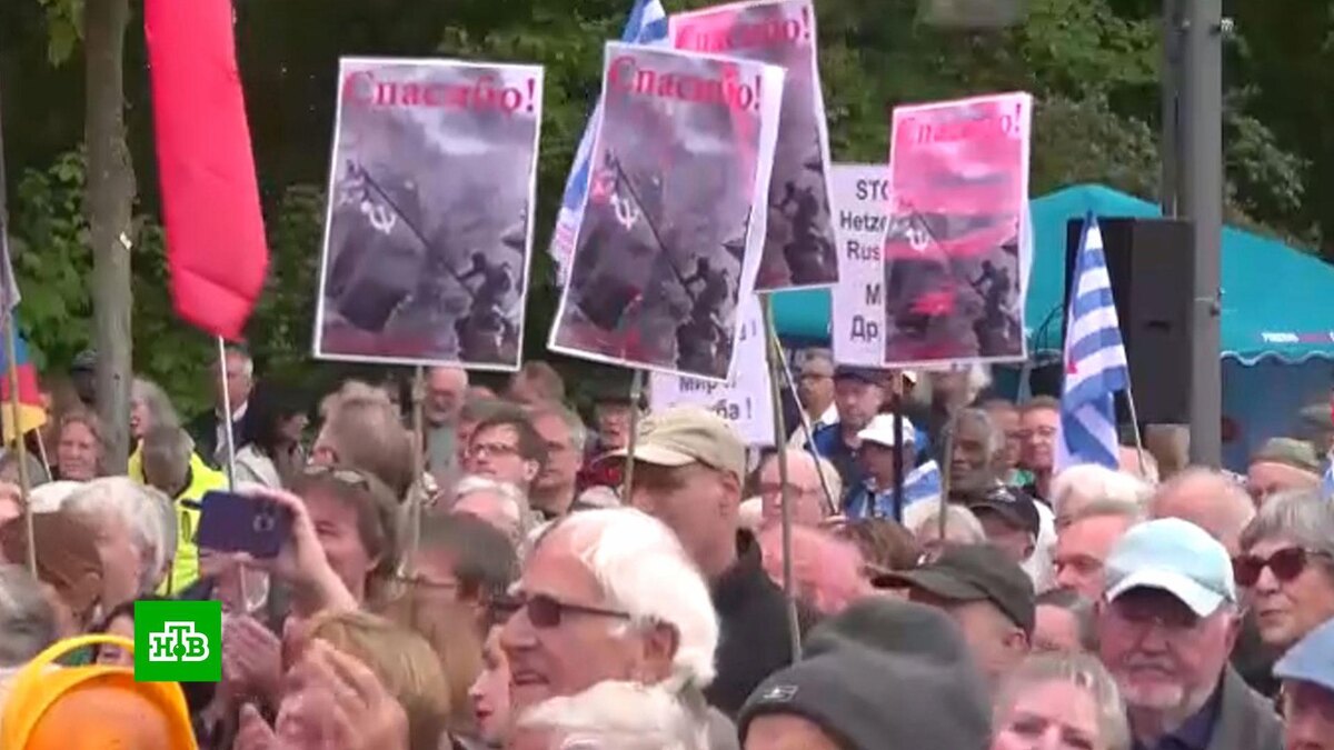 [ Смотреть видео на сайте НТВ ] В Берлине у мемориала советскому Воину-освободителю прошел митинг. Сотни немцев, которые приехали из разных частей страны, выступили против переписывания истории и отдали дань памяти бойцам Красной армии, которая избавила их страну от фашизма. На митинге активно критиковали нынешний политический курс Берлина. Активисты выступают против любой формы конфронтации с Россией. На плакатах можно было увидеть лозунги в защиту российско-германской дружбы и даже напоминание канцлера Отто фон Бисмарка «Никогда против России». [ Смотреть видео на сайте НТВ ]