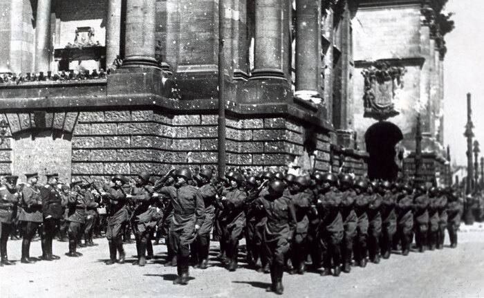 Близится День Победы — ровно 80 лет назад, 4 мая 1945 года, в Берлине состоялся первый парад советских войск У разрушенного Рейхстага и по площади Бранденбургских ворот торжественным маршем прошли советские войска. В тех же гимнастерках, в которых штурмовали город. На окраинах ещё слышались отзвуки последних боёв, но Берлин уже был побеждён. Принимали парад маршал Георгий Жуков и военный комендант Берлина, генерал-полковник Николай Берзарин. Город был разрушен, солдаты находились в состоянии войны, однако на площади удалось собрать около 2 тысяч военнослужащих и примерно 50 единиц техники.