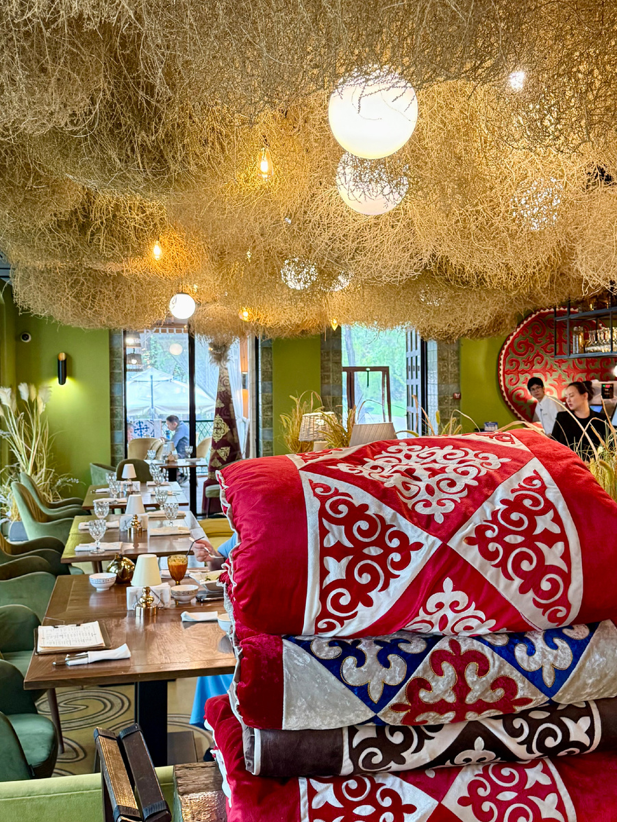 Прибыли в отпуск в Алматы (Казахстан). И пошли по местным ресторанам. Посетили Qaimaq. расположен несколько отдаленно от центра, но на крупной улице, на оживленном перекрестке. Входная группа и территория стилизованы под казахский аул: кони искусственные пасутся, юрты стоят. Спокойно, просторно и красиво. Несколько больших беседок разбросано по зеленой траве. Для больших гулянок лучше и не найдешь. Мы зашли в центральное здание. Внутри большой бар, много столов и стилизация национальными тканями, костюмами, тарелками. Уютно. Сразу принесли Презент бурсак. Бурсаки - это такие пончики в виде колобков. Но бывают и не колобки, как на фото. Очень вкусные, как советские пончики или пышки в Питере. Подаются с вареньем, но тут подали с густой ароматной сметаной. Чуть не подрались за нее. И это был комплемент. 5+ Лимонад ежевика-апельсин порадовал натуральностью, содержал пюре, был на льду и не приторный. 5 Морс клюквенный привел в восторг мужа. Ягод не пожалели, охладили. Фото нет, но сто