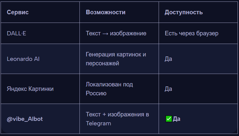 MidJourney – одна из самых популярных нейросетей для генерации изображений из текстового описания. Она используется дизайнерами, маркетологами, художниками и просто любителями экспериментировать с искусственным интеллектом. Однако в России официальный доступ ограничен, а подписка платная. Но это не повод отказываться от такого мощного инструмента. В этой статье ты узнаешь: А ещё мы расскажем про Telegram-бота @vibe_AIbot, который позволяет бесплатно генерировать изображения и текст , как в MidJourney. С начала 2023 года OpenAI и другие крупные платформы ограничили доступ из России. Хотя MidJourney технически не принадлежит OpenAI, его серверы также недоступны большинству российских пользователей. Что делать? Последний способ — самый простой и быстрый. Никаких установок, регистрации или сложных настроек. MidJourney предлагает бесплатный пробный период, но он доступен только при регистрации с разрешённого региона. Для жителей России остаются такие варианты: 💡 Один из лучших способов — @