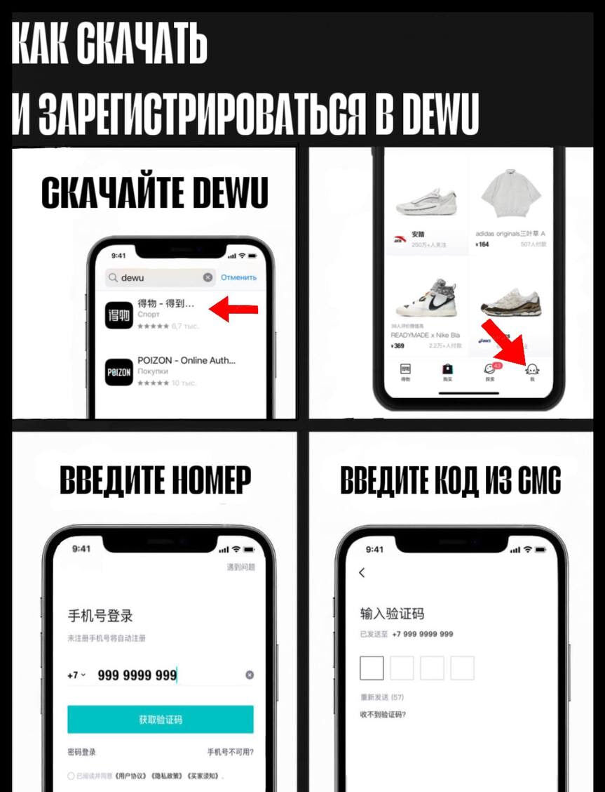 Как скачать Poizon (DEWU)? Держи короткий, но понятный гайд, как установить приложение на iPhone и Android. 📥 Скачать Poizon (DEWU): Скачать для Android Скачать для iPhone Для iPhone: Приложение доступно в App Store: 1 Заходишь в App Store, вбиваешь “DEWU” (или “得物”) 2. Скачиваешь приложение со значком и иероглифами (как на картинке) ⚠️ Важно: Не путай с приложением “Poizon” — оно часто всплывает, но это не то. Оригинальное название платформы — 得物 или DEWU. Именно его и нужно ставить. 🤖 Как зарегистрироваться? После установки: 1. Открываешь приложение 2. Жмешь на иконку справа снизу (как на картинке) 3. Меняешь код страны с “+86” на “+7” 4. Вводишь номер, получаешь код — и ты в игре Если появятся вопросы — пиши нам @the_poiz_adm! Поможем разобраться и сделать первый заказ 🖤