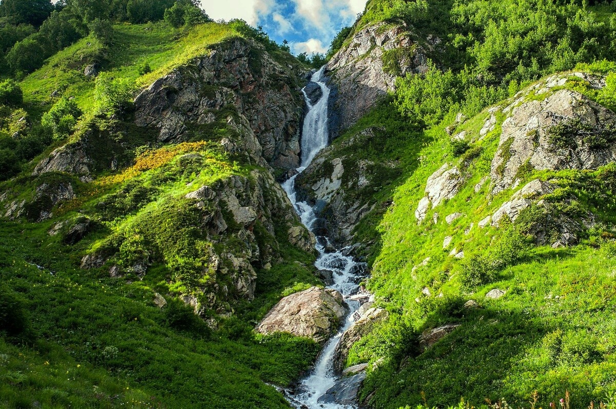 Домбай – горный курорт Карачаево-Черкесии. Он величественен и многогранен! Туристов привлекают уникальные исторические достопримечательности и природные красоты – горы, ледники, реки, озера, водопады. © «wikiway.com»