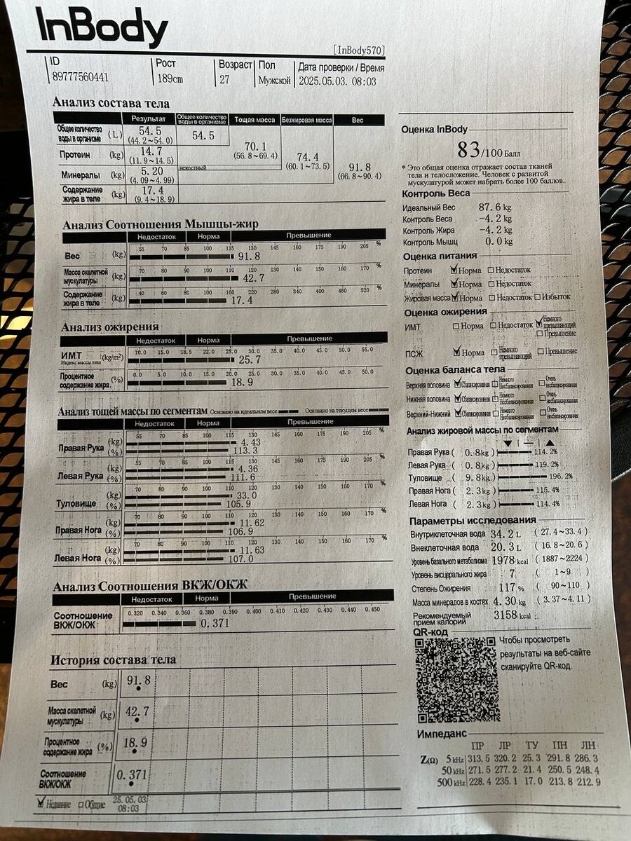 Сделал биоимпеданс в зале Мышцы чуть выросли, жирок чуть ушел с прошлого раза. Вес тоже чуть увеличился за счет этого. Но все эти вертикальные биоимпедансы в зале не очень точны. Они не проходили лицензирования как медицинское оборудование и могут иметь серьезную погрешность. Если хотите получить более-менее достоверную информацию обращайтесь в клиники с сертифицированными биоимпедансами, которые делают в горизонтальном положении. И если честно особенно париться не стоит, что из-за цифр на весах, что из-за данных импеданса. Если вы занимаетесь спортом, следите за своим питанием, то качество тела и так будет потихоньку меняться. В этом месяце лучше, в следующем чуть хуже, потом опять получше. На горизонте года все равно все будет позитивно. Думаем долгосрочной перспективой, а не быстрым результатом.
