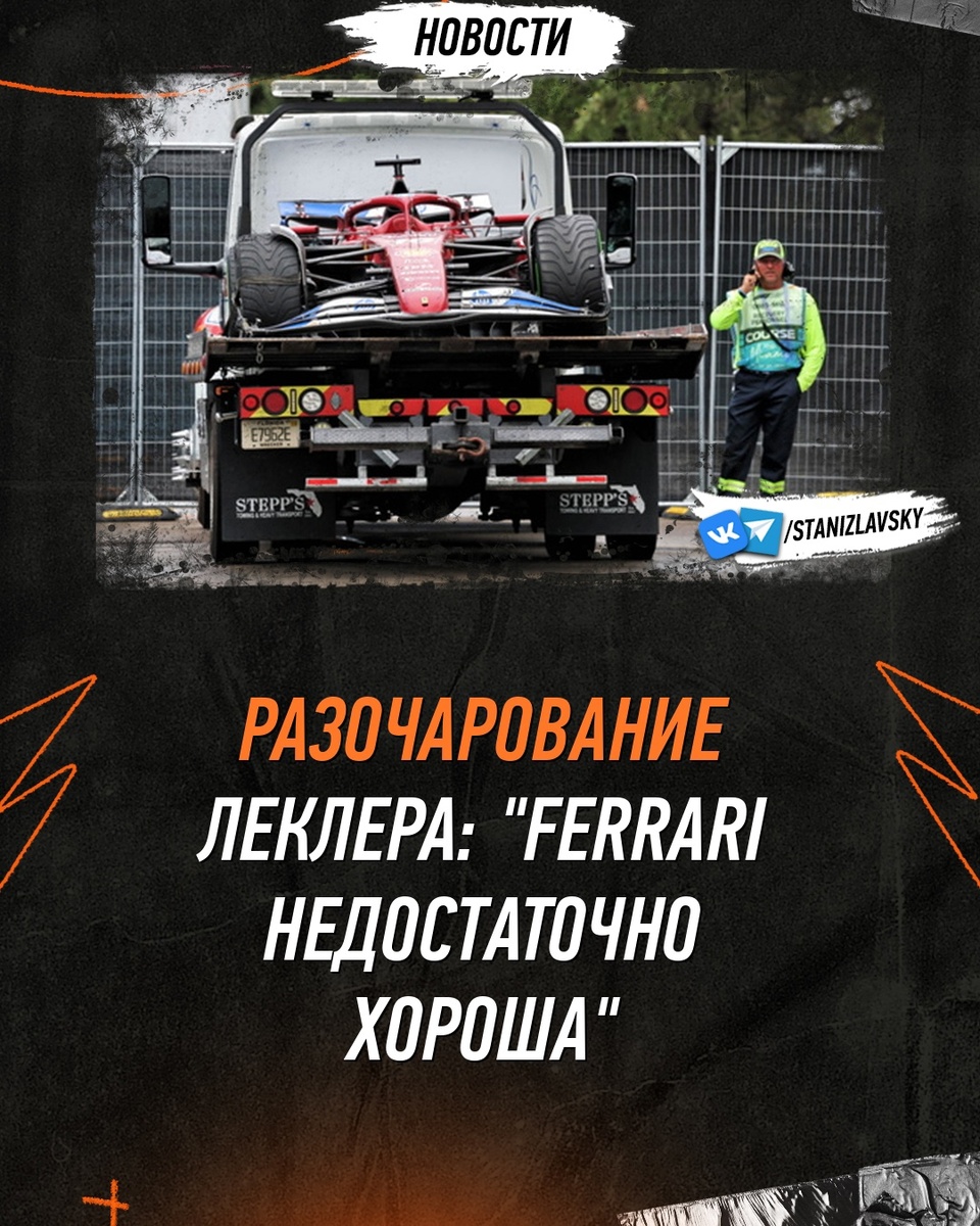 Шарль Леклер настаивает на том, что машина Ferrari неконкурентоспособна. "Я не могу принять нынешнюю ситуацию! Она расстраивает, потому что было уже немало гонок, в которых я чувствовал, что проделал действительно хорошую работу, но если при этом ты финишируешь четвертым, пятым, шестым, седьмым, восьмым, это просто позор". "У меня нет никакого удовлетворения от того, что я хорошо поработал". "Я просто надеюсь, что мы сможем переломить ситуацию как можно скорее, но на данный момент дела обстоят вот так, и я мало что могу сделать". Ранее в субботу Леклер попал в аварию из-за мокрых условий перед началом спринтерской гонки, что вызвало красные флаги. "В данном случае это чисто моя вина. Выезжать на промежуточных шинах в таких условиях было не лучшим выбором". "Я чувствовал себя пассажиром, потому что это произошло на прямой. Я просто ехал, пока полностью не потерял контроль над машиной из-за аквапланирования, и у меня не было возможности выйти из ситуации". "Очень разочарован. Все так, ка
