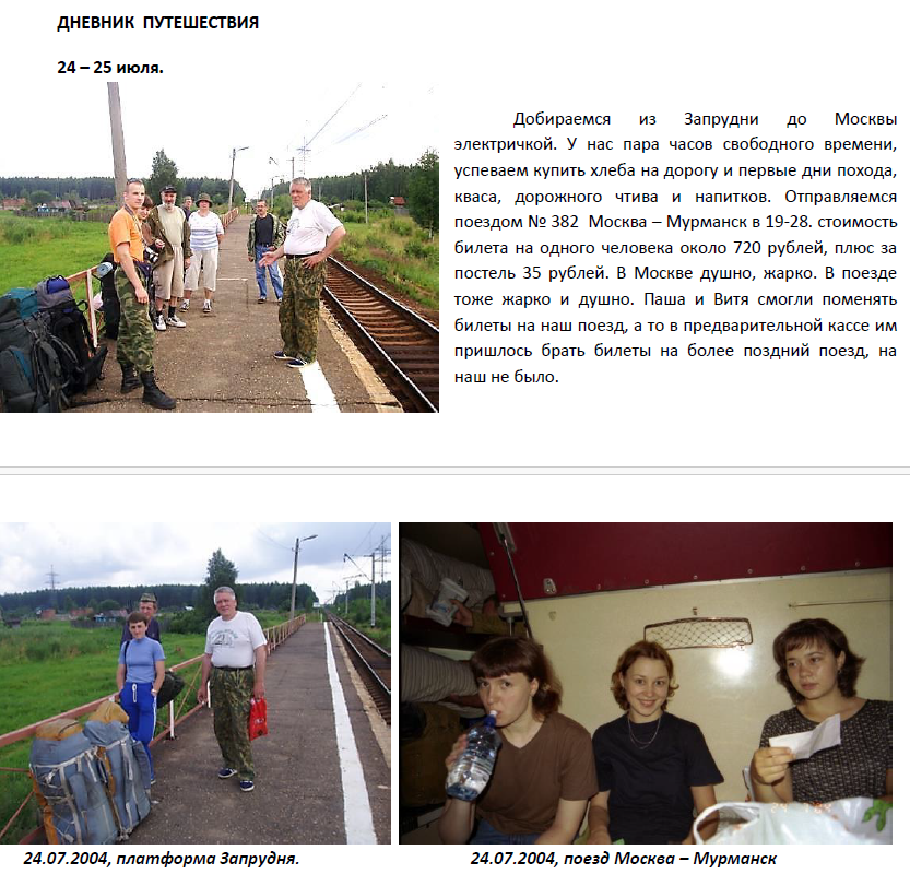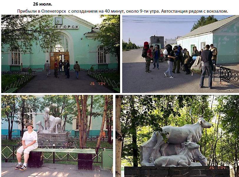 Заброска на начало маршрута. От Москвы до станции Оленегорск любым поездом Москва – Мурманск. Удобен поезд № 382, отправление из Москвы в 19-28, прибытие в Оленегорск около 8-00. Цена билета примерно 780 рублей, постель в вагоне ещё 35 рублей (2004 год). Время в пути 36 часов с небольшими минутами.