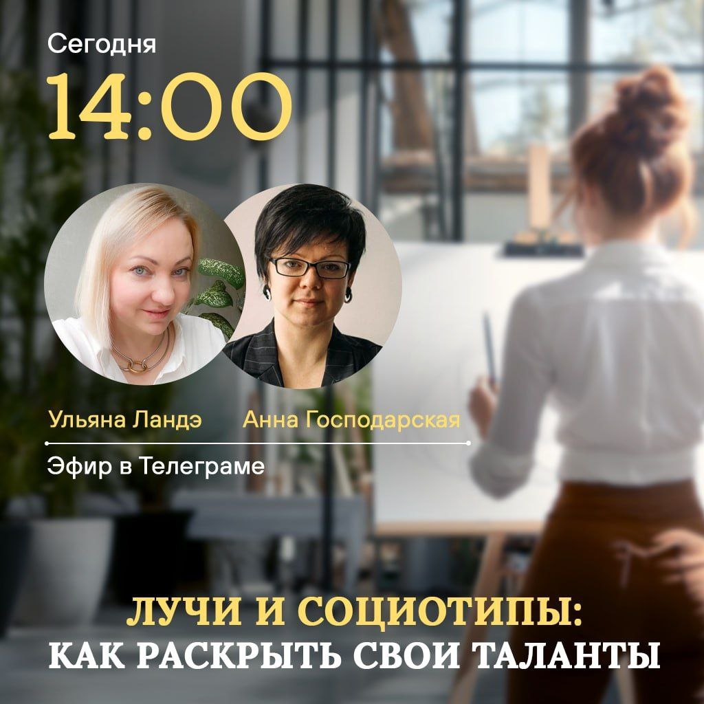 Уже сегодня в 14:00 пройдёт эфир «Лучи и социотипы: как раскрыть свои таланты» с Ульяной Ландэ и Анной Господарской