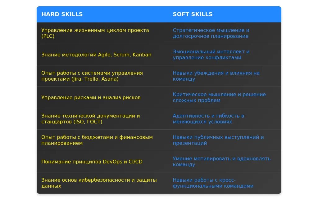 - Ключевые: Управление командой, бюджетирование.