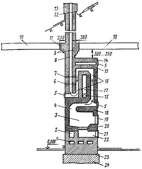 Устройство печи: 1 - шанцы, 2 -подтопочный канал нижнего обогрева, 3 - топливник, 4 - проем в перекрытии топливника (хайло), 5 - чистки, 6, 7 - задвижки, 8 - дымовой канал (дымоход), 9 - разделка, 10 - перекрытие, 11- теплоизоляция, 12-- выдра, 13 - дымовая труба, 14 - перекрыша, 15 - душники, 16 - конвективная система, 17 - камера, 18 - свод, 19, 21 - дверки, 20 - решетка, 22 -поддувало (зольник), 23 - гидроизоляция, 24 - фундамент