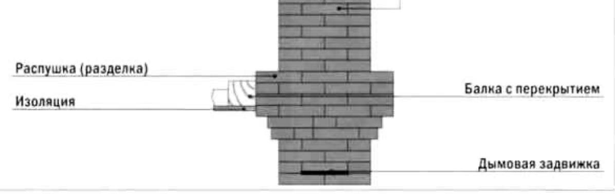 Распушка (разделка) - расширение трубы в том месте, где она проходит через потолок. Ее назначение — защищать деревянные потолки и перекрытия от перегревания. Распушку выкладывают толщиной не менее одного кирпича и теплоизолируют стекловолокном, либо каолиновой ватой.