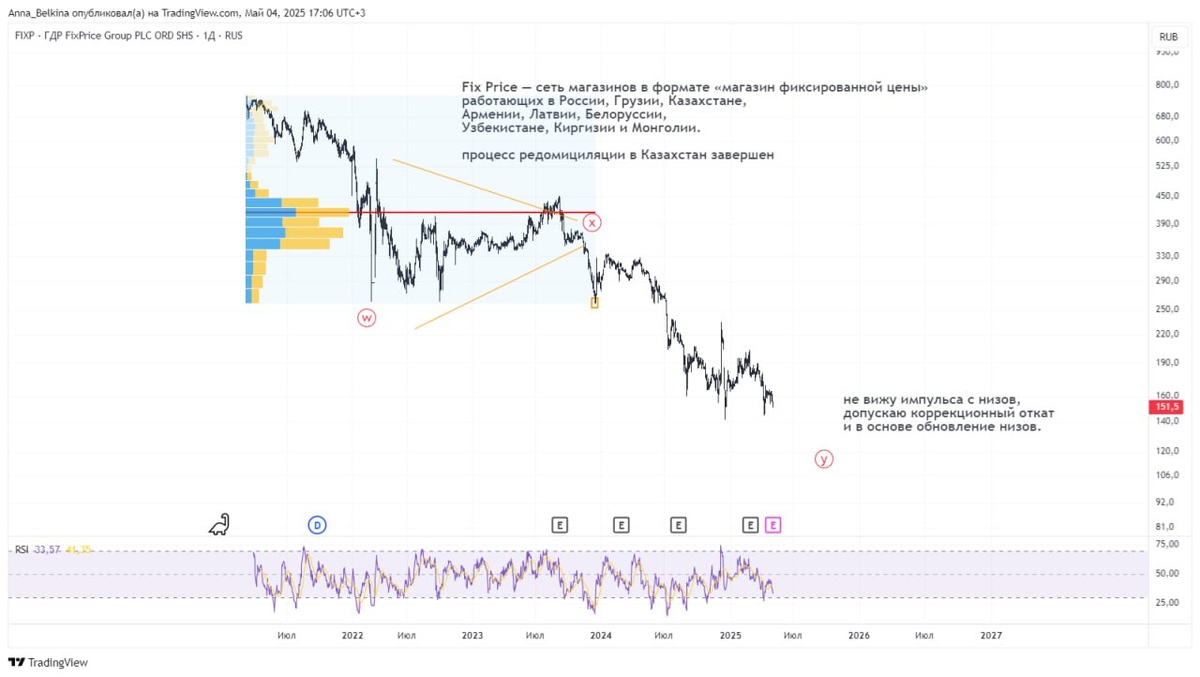 #ПотребСектор_НЕцикличные #FIXP #FIXPDR #1W Сектор: Потребительские товары, нецикличные ГДР FIX PRICE GROUP PLC. https://dzen.ru/media/id/65b8789ff12bfe0796a26941/ru-fixpdr-1w-sektor-potrebitelskie-tovary-neciklichnye-nedelnyi-grafik-65e55704b619811b63fb7357 Бумага движется в рамках обозначенного нисходящего двойного зигзага. Волна [x] встала в виде треугольника, далее состоялся выход вниз в волну [y], которая находится еще в процессе формирования. Не является ИИР