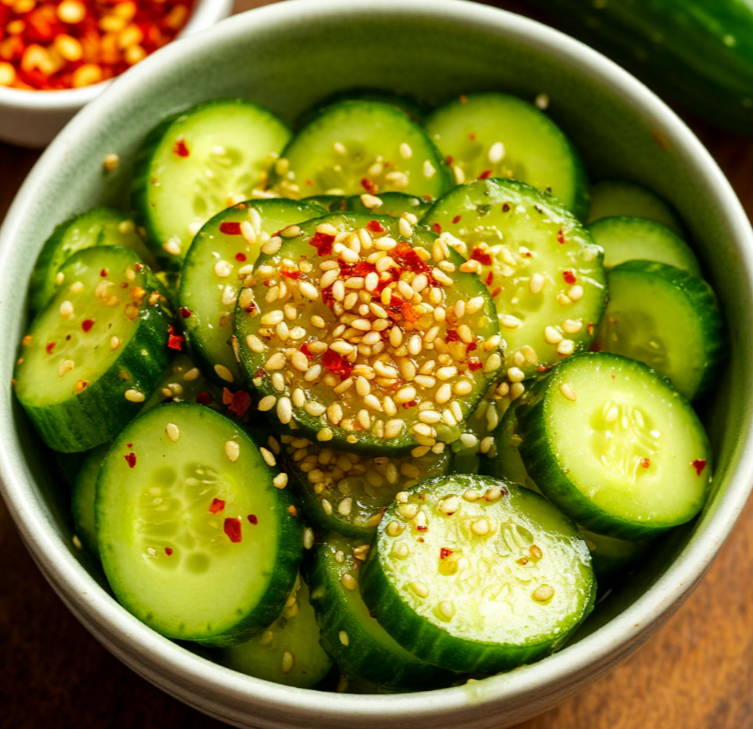 Приготовим огурцы по-корейски быстрого приготовления – острую и пикантную закуску, которая отлично подойдет к любому блюду! 300 г свежих огурцов тщательно моем и нарезаем тонкими брусочками или кружочками. Складываем нарезанные огурцы в миску. 1 крупный зубчик чеснока очищаем и пропускаем через пресс или мелко нарезаем. В небольшой сковороде разогреваем 1 ст.л. растительного масла. Обжариваем чеснок в разогретом масле в течение 10-15 секунд, до появления аромата. Важно не пережарить чеснок, чтобы он не горчил. В миску с огурцами добавляем обжаренный чеснок вместе с маслом. Добавляем 1 ст.л. столового уксуса, 1 ст.л. соевого соуса, 1 ч.л. соли и щепотку (на кончике ножа) красного жгучего молотого перца. Тщательно перемешиваем все ингредиенты. 1 ст.л. кунжута обжариваем на сухой сковороде до золотистого цвета. Добавляем обжаренный кунжут в миску с огурцами. Еще раз тщательно перемешиваем. Накрываем миску пищевой пленкой или крышкой и ставим в холодильник на 30 минут для маринования. Чем