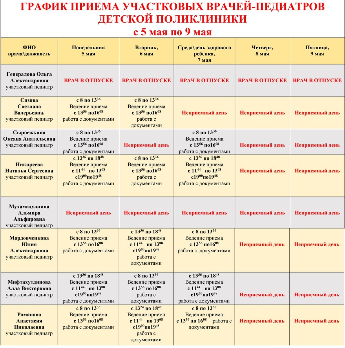 Расскажем, как принимают врачи детской поликлиники Можайской больнице с 5 по 9 мая Время работы прививочного кабинета в рабочие дни с 10:00 до 15:00 (перерыв для санитарной обработки кабинета - с 13:00 до 13:30) Время работы процедурного кабинета (забор анализов) - с 8:00 до 10:00. Обед - с 13:00 до 13:30. Среда – День здорового ребенка! Прием осуществляется детей первого года жизни и для проведения вакцинации. Все вопросы, касающиеся приема врачей, а также о наличии вакцины, можно задать в регистратуре детской поликлиники по телефону: 8-49638-20-071 (время работы с 8:00 до 20:00 рабочие дни, в субботу с 9:00 до 14:00). Телефон заведующего детской поликлиникой Юлии Владимировны Силинской 8-49638-21-827 (с 7:30 до 16:00 по рабочим дням). Будем рады, если этой информацией Вы поделитесь со своими близкими и друзьями и она будет полезной для Вас)