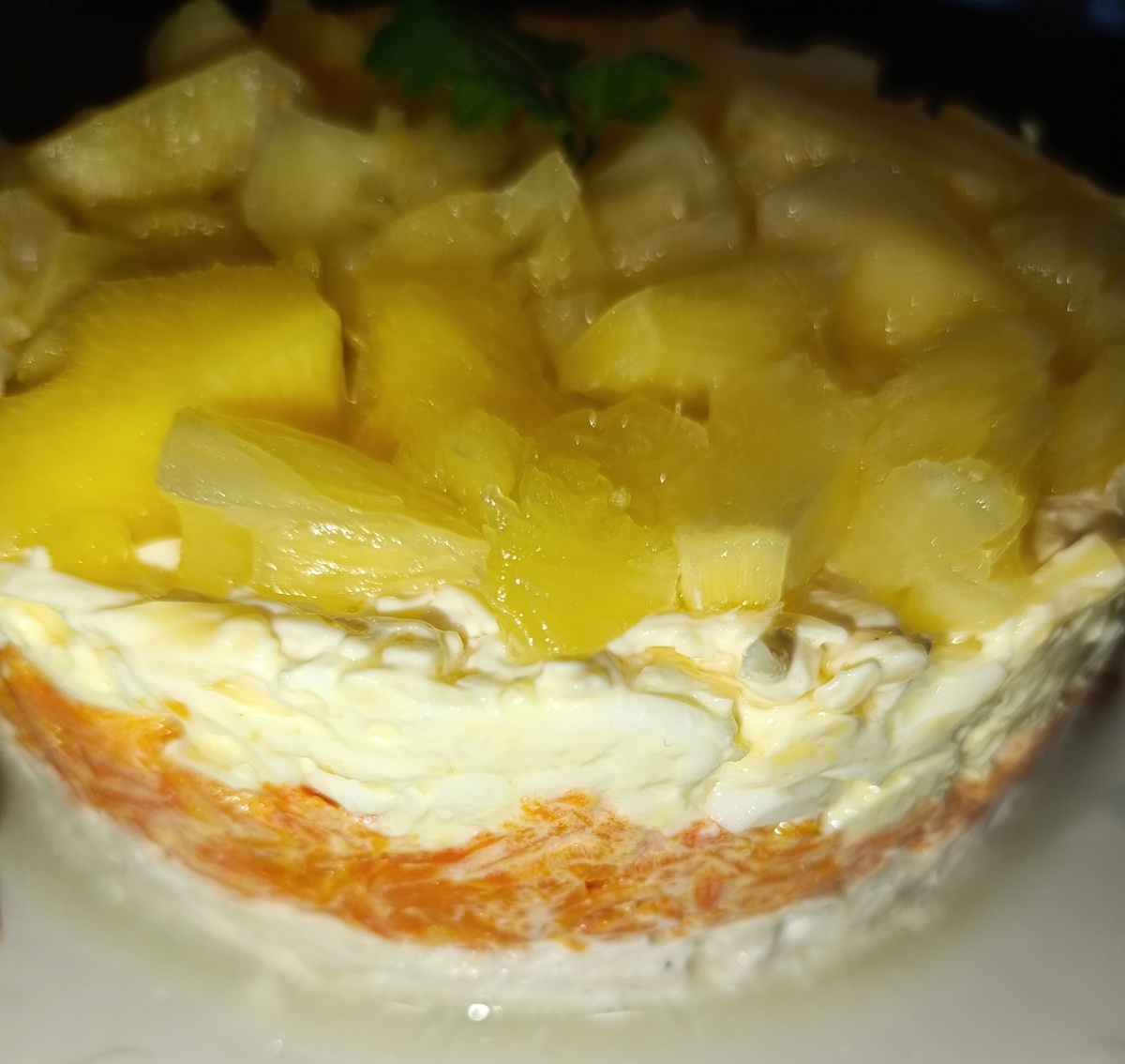 Ингредиенты: Куриное филе - 300 гр Сыр - 100 гр Яйца - 3 шт Морковь - 2 шт Майонез - 100 гр Ананас консервированный или киви Куриное филе отвариваем, нарезаем кубиком, смешиваем с майонезом и выкладываем в салатник. Морковь отвариваем, натираем на терку, смешиваем с майонезом и выкладываем сверху курицы. Яйца отвариваем, натираем на терку, смешиваем с майонезом и выкладываем сверху моркови. Сверху натираем на терку сыр, смазываем майонезом. Сверху выкладываем ананас или нарезанный киви. Сразу скажу, что вкус салата с ананасом и киви разный. Можно сказать, что это 2 салата. Попробуйте!!!! Приятного аппетита!!!!