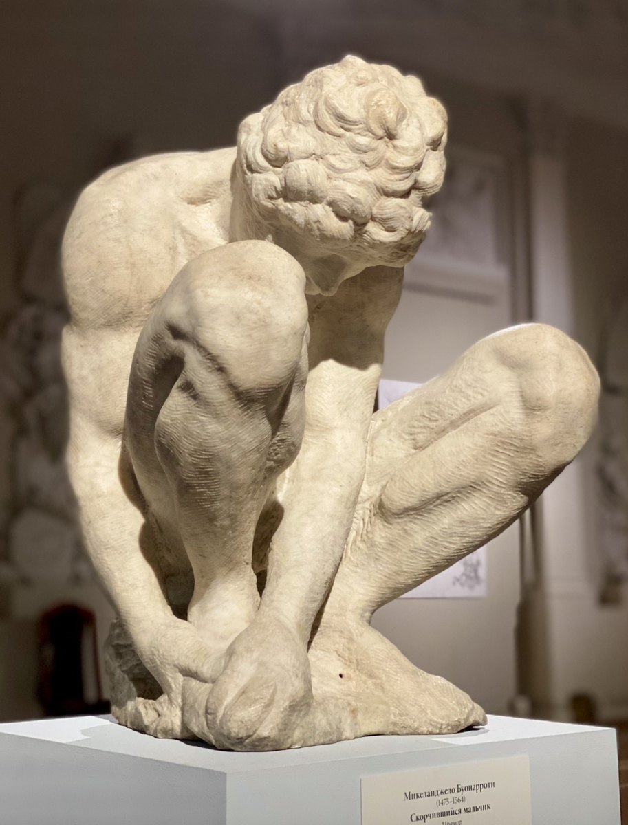 Единственная работа «Титана Возрождения», оказавшаяся в нашем отечестве - это незаконченная (как многое у великого мастера) детская фигура получившая название «Скорчившийся мальчик». Считается, что она предназначалась для надгробия Лоренцо Великолепного, но это конечно не единственная версия… В любом случае именно у семейства Медичи в своё время эта работу купили англичане, а из собрания Лойда Брауна в 1785-м она (за весьма внушительную сумму) перебралась в коллекцию Екатерины Великой. С той далекой поры этот мальчик - одно из главных сокровищ Эрмитажа. К слову, есть мнение что эта работа вообще была выполнена учениками Микеланджело. Тут судить не берусь, хотя неподражаемая пластика гения уроками не передаётся на мой взгляд…