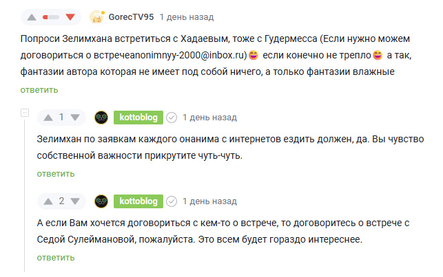 Меня до слез умилил этот детский развод на "слабо". Самое смешное, что защитник Халида и медалей настолько серьезен, что даже почту оставил онанимную. С - солидность! И мне прям интересно, человек на полном серьезе полагает, что взрослый боевой офицер Росгвардии Зелимхан, находящийся в госпитале после очередного ранения, прочитает коммент, схватит костыли и, вприпрыжку, ломанется в Гудермес, как пацан? Чтобы что? Доказать онаниму из интернетов свое существование? И, бонусом, раскрыть себя, свою семью и получить вагон проблем? То есть, мной сделано все, чтобы у Зелимхана не возникло проблем и его личность не стала известна. Куча читателей здесь, на Пикабу, переживала, что даже имени может хватить, чтобы его пробить. А тут какой-то персонаж хочет его деанонимизировать с целью создать ему и, автоматически, всей его семье проблем, даже не скрывая этого. Он открыто пишет у себя на странице:стоит сообщить об этом как в бараний рог скрутят Зелимхана😄" (с). Достаточно зайти на его страницу, чтобы понять, в чьих интересах персонаж "работает" и кого продвигает. А Зелимхан, если что, специально служит в другом регионе. По понятным всем причинам. Аргументация же персонажа на уровне младших классов: приходи или зассал. И искренне удивляется, что этого не будет.