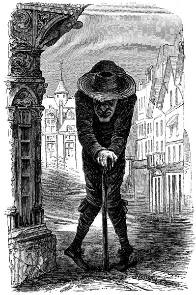 Данная гравюра изображает горбуна-бездельника во Дворе чудес. Я не нашел датировку создания рисунка, но, вероятно, он достаточно поздний, хоть в краткой аннотации его и называют старым. Думаю, тоже ориентировочно XIX век.