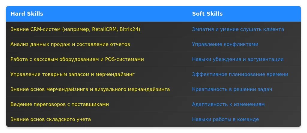 После адаптации: "Работа с CRM-системами, клиентоориентированность, управление запасами, навыки переговоров."