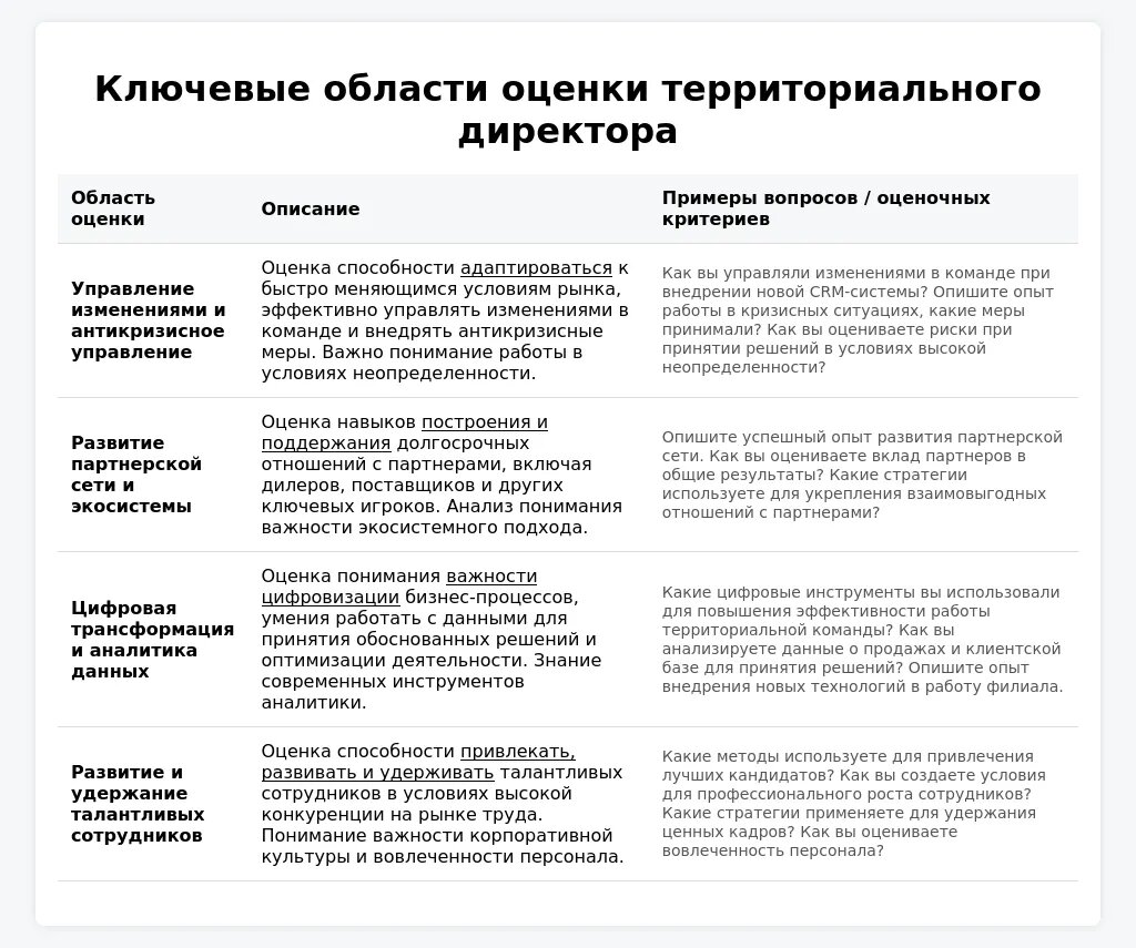 Работодатели оценивают кандидатов на позицию территориального директора по нескольким ключевым областям: