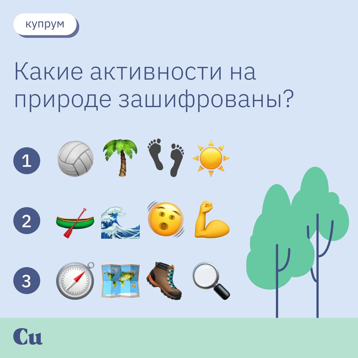 Предлагаем немного размяться — давайте разгадаем ребус! ➡️ В эмодзи три вида активностей на природе. Угадаете, какие? Пишите свои версии в комментариях 🏖️ 💋 лучше всего его скрыть под спойлером, чтобы не подсказывать другим Ответы — в понедельник.