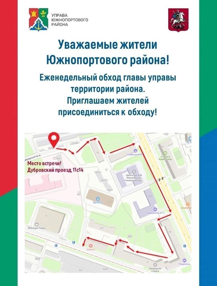 Уважаемые жители Южнопортового района! 5 мая, глава управы Южнопортового района проведет обход территории. Начало обхода в 14:00. Место встречи: Дубровский проезд, 11 стр 14 и далее по маршруту. На обходе будут присутствовать: глава управы, первый заместитель главы управы, руководитель и заместители руководителя ГБУ «Жилищник района Южнопортовый», начальник участка и муниципальные депутаты. Вы сможете задать вопросы, обсудить важные темы и поделиться своими предложениями по улучшению жизни в нашем районе. Ждем Вас на встрече!