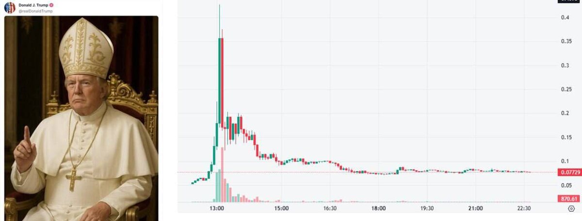 В ответ на пост 🗣 Трамп опубликовал фото в образе Папы Римского и спровоцировало взлет мемкоина POPE на Solana. Токен вырос на 1000% после поста президента. Аналитики предполагают, что за POPE стоит команда, ранее запускавшая TRUMP и MELANIA.