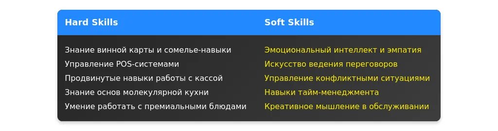 Для опытных официантов важно подчеркнуть достижения, профессиональный рост и специализацию. Примеры: