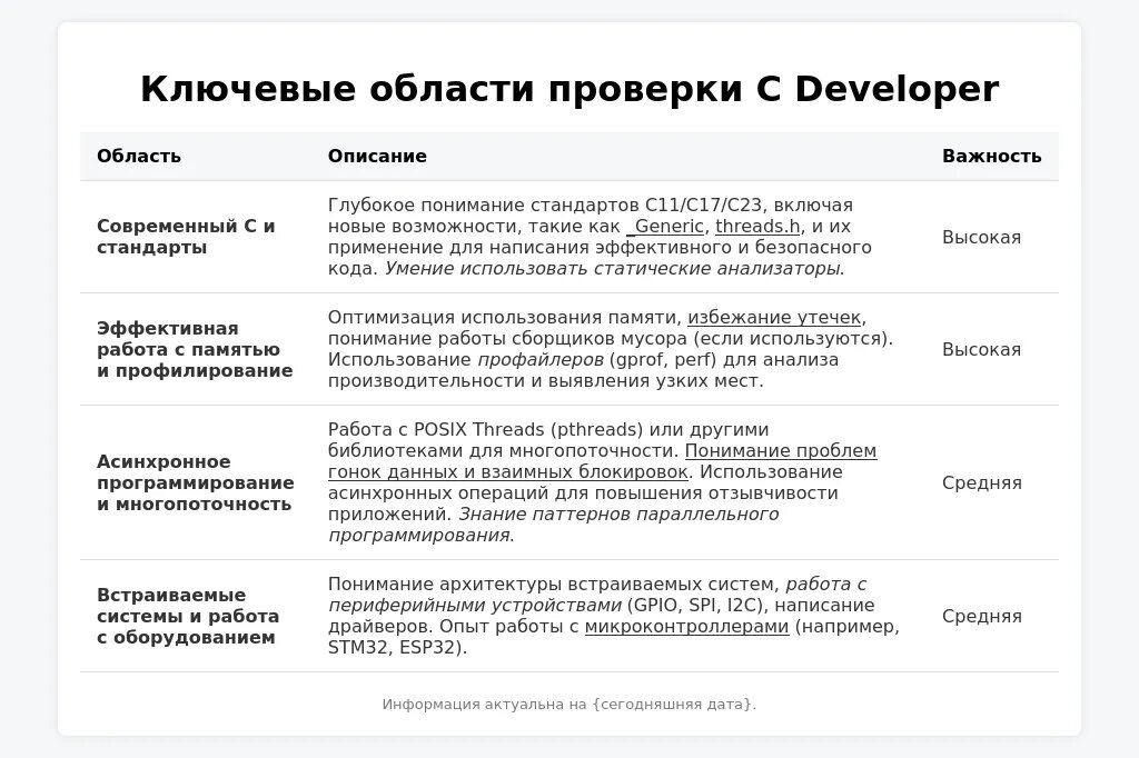 - Технические навыки: глубокое знание языка C, понимание принципов работы с памятью, опыт работы с различными библиотеками и фреймворками. Например, могут попросить написать функцию для работы со структурами данных или объяснить концепцию указателей.