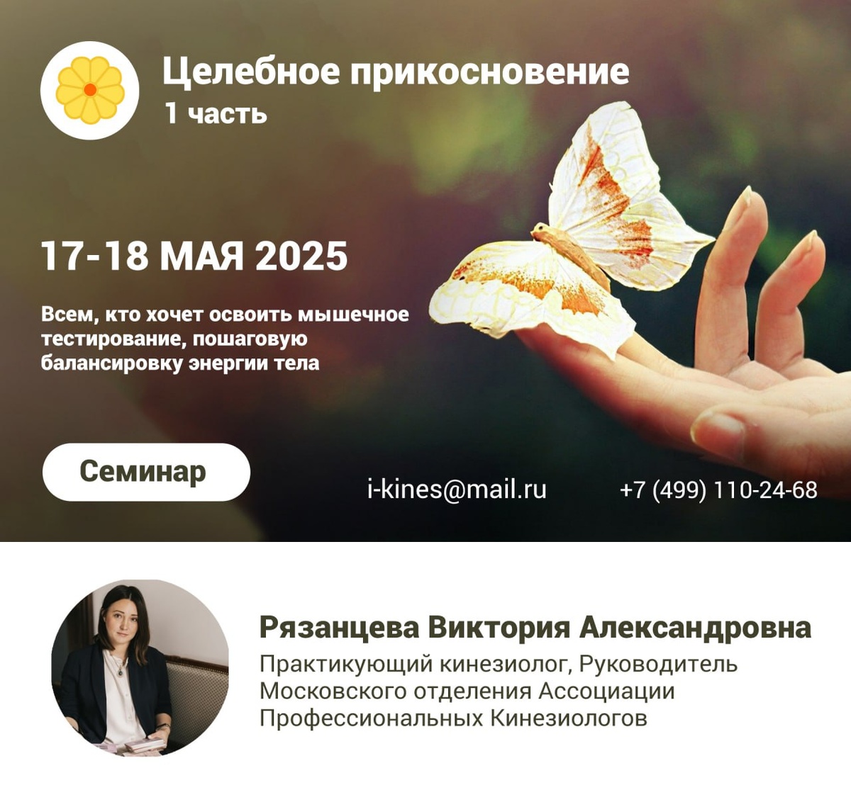 Дорогие друзья🌿 Продолжается запись на семинар "Целебное прикосновение — 1", который пройдет с 17 по 18 мая 2025 года Семинар проведет Рязанцева Виктория Александровна — практикующий кинезиолог, руководитель Московского отделения Ассоциации Профессиональных Кинезиологов ❗️Это семинар — вход в кинезиологию! Он нужен всем, кто хочет разобраться в своем здоровье и научиться помогать близким людям и клиентам — в случае профессиональной работы 💫 Вы получите основную информацию по каждой мышце: расположение мышцы, ее тестирование, какие симптомы указывают на её дисбаланс, с каким меридианом, органом или железой эта мышца связана ☝️ Освоение способов балансировки каждой мышцы: нейролимфатические и нейрососудистые точки, спинальные рефлексы; меридиан и продукты питания для каждой мышцы. 7 техник балансировки для каждой мышцы Подробнее о семинаре можно узнать в личных сообщениях группы ВК или по ссылке — https://kinesioportal.ru/events/2529/15506.php