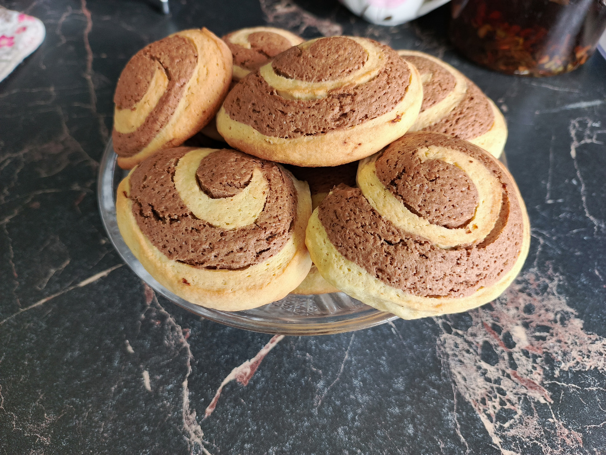Песочное печенье серпантин. Для него нам понадобится маргарин 1п (180 гр)/ или сливочное масло мука 400гр яйцо 2шт сахар 150 гр ( кто любит менее сладкое кладите меньше) ванилин 0,5 ч.л. разрыхлитель для теста 1 ч л какао 3-4 ч.л растопим маргарин и смешаем его с сахаром, ванилином и яйцом. Далее отдельно смешаем муку ( 300гр) с разрыхлителем. Соединим муку с маргарином и вымесим тесто.Затем разделим его на 2 части и в одну половину добавим какао. раскатаем оба кусочка в одинаковые пласты толщиной 1 см и наложим один на другой. Затем свернем в рулет нарежем его на кусочки толщиной 1-1,5 см ( у меня получилось 13 шт). Выложим на противень Ставим в разогретую до 180 градусов духовку и выпекаем 15- 20 мин. Приятного аппетита!