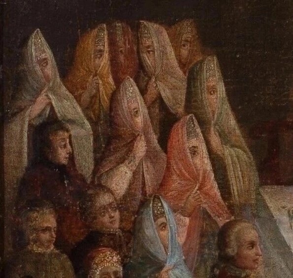 На самом деле, в истории православной России существовала традиция закрывать лица женщинам. То есть это не одноглазые женщины — они совершенно обычные! Однако большую часть своего лица они скрывали, находясь в обществе, вне дома. Эти женщины исповедовали православие и жили в одном из древнейших городов Тверского края. Где же была такая традиция? Я узнала о ней благодаря картине «Смотрины в городе Торопце», созданной неизвестным художником в XVIII веке! На ней изображён жених, пришедший на смотрины, одетый по европейской моде. А его родственницы почти все облачены в традиционные наряды, как это было принято в Торопце. На них высокие кокошники и платки, закрывающие лица, оставляя открытым лишь один глаз — чтобы ориентироваться в пространстве. Это лишь часть картины. На другой её стороне изображён праздничный стол, за которым сидит невеста с подругами. Но у них лица закрыты иначе! Так, что не сразу понятно, кто из них является невестой.