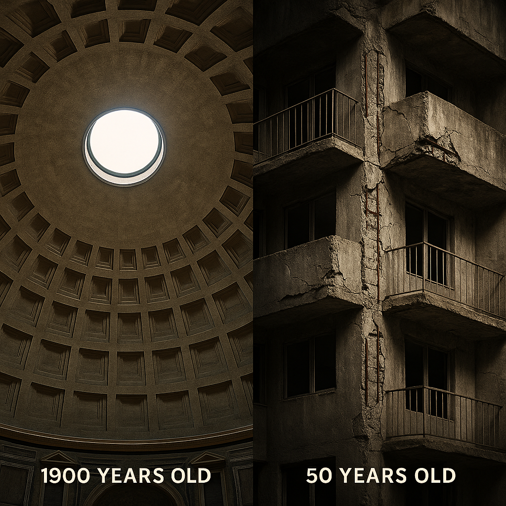 Римляне, кажется, исповедовали противоположную философию: "Мы строим не на десятилетия, а на тысячелетия". Их бетон застывал месяцами, а полную прочность набирал годами. Но они могли себе это позволить — отчасти потому, что использовали дешёвый труд рабов и не считали время таким уж ценным ресурсом, отчасти потому, что строили для вечности.