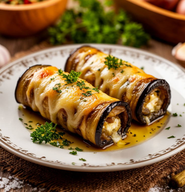 Сегодня приготовим аппетитные и простые в приготовлении рулеты из баклажанов с сыром и чесноком! Берем 1 крупный баклажан, моем и нарезаем вдоль тонкими слайсами, толщиной примерно 3-4 мм. Нарезанные баклажаны выкладываем в миску, солим по вкусу и оставляем на 15-20 минут, чтобы ушла горечь. Пока баклажаны настаиваются, приготовим начинку. 100 г сыра натираем на мелкой терке. 2 зубчика чеснока пропускаем через пресс или мелко нарезаем. Смешиваем натертый сыр и чеснок, добавляем 1 ст.л. майонеза. Тщательно перемешиваем начинку. Баклажаны промываем под проточной водой и обсушиваем бумажными полотенцами. Разогреваем сковороду с 4 ст.л. растительного масла. Обжариваем баклажаны с обеих сторон до золотистого цвета, примерно по 2-3 минуты с каждой стороны. Обжаренные баклажаны выкладываем на бумажные полотенца, чтобы убрать лишнее масло. На каждый слайс баклажана выкладываем небольшое количество сырно-чесночной начинки и аккуратно сворачиваем в рулет. Готовые рулеты выкладываем на тарелку и