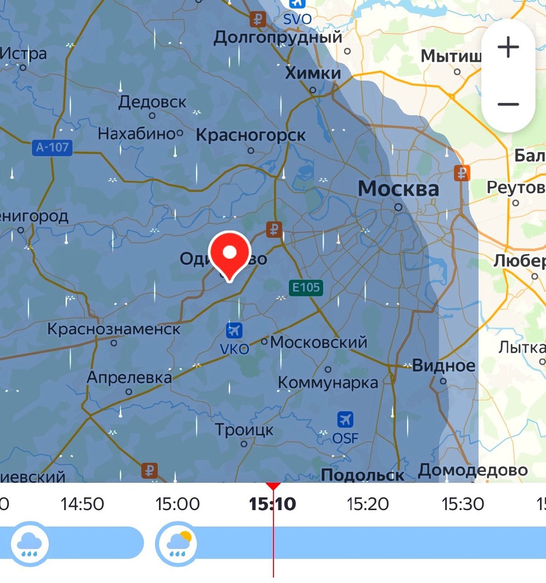 Ливень с грозой надвигаются на Одинцово Ухудшение погоды начнется с 15 часов. Также ожидаются порывы ветра до 17 м/с. Такая погода продлится до поздней ночи. Источник
