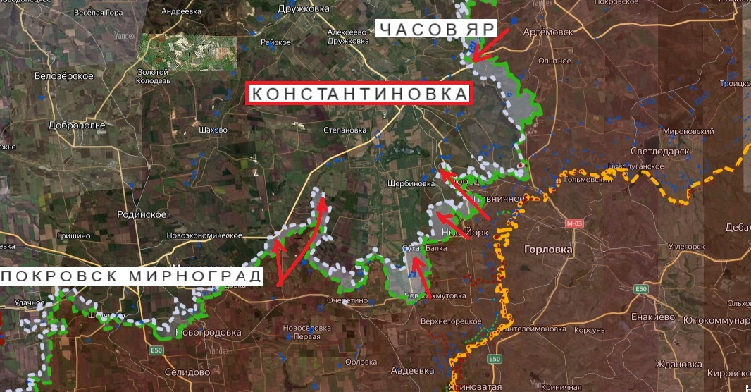 Очень хорошо идут дела у наших вот в этом районе: Ещё до Пасхи наши тут добились успеха, преодолели первую линию, которую с той стороны укрепляли достаточно долго и рассчитывали наших тут сдерживать продолжительное время. Может поэтому тут и не было движения больше года, но когда движение началось, то оно сразу же началось с успешных действий. Кстати, мы такое развитие событий предсказывали (хотя предсказывали – это громко сказано, просто это вытекало из логического развития событий) ещё в конце января: Сейчас обстановка складывается таким образом, что наши формируют сразу три вектора захода в город, один из важнейших в логистическом отношении, между прочим. Хотя тут неважных городов нет. Также несколько позже мы писали, что первым актом операции будет ликвидация этого кармана: Эта карта ещё от 10 апреля. Как видим, за месяц, с учетом пасхальной остановки наши очень неплохо расширили западную клешню, перешли дорогу в ещё одном месте. На западе также продвинулись в сложных условиях, зак