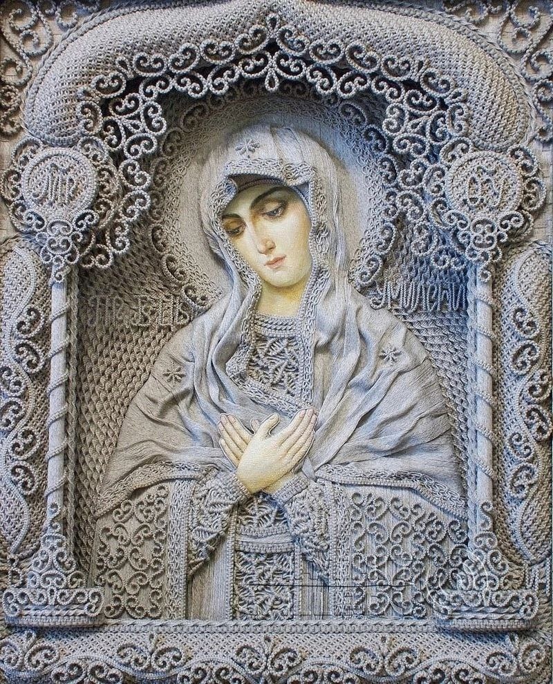 На одну икону у него уходило до полугода кропотливой работы. В одном образе могло быть до 15 млн узелков! Лики и ладони крымский мастер рисовал маслом, а облачения и фоны – в технике «макраме-коллаж» и «рукотворная ткань» (разработку он официально запатентовал). Толщина льняных нитей – полмиллиметра!