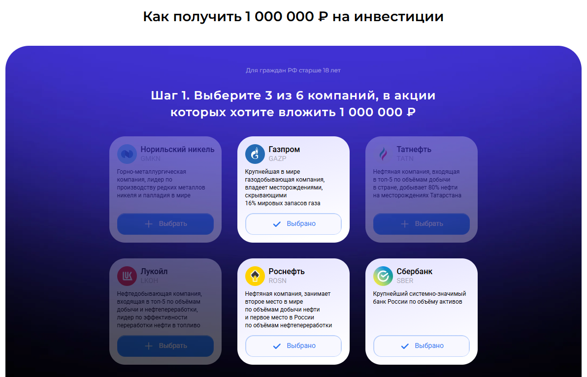 Я решила принять участие в акции от Совкомбанк Инвестиции под названием "Миллион на инвестиции". Рассказываю что да как и почему. Те кто откроет новый брокерский счет, могут поучаствовать в акции. Совкомбанк позволяет выбрать 3 компании из 6 и вложить в них виртуальный миллион рублей. Если акции подешевеют за месяц, то инвестор ничего не потеряет, но и не получит. Если акции подорожают, то инвестор получит долю от бумажной прибыли, а какую именно долю зависит от того сколько своих денег он проинвестирует через данного брокера. Доля определяется как результат деления вложенных собственных денег в любые активы на 1 миллион рублей. Я вот завела своих 100к, поэтому если виртуальный портфель вырастет на 2000 рублей, я получу 2000 х 100 000/1 000 000 = 200 рублей. А вот список активов, которые я могла выбрать для виртуального портфеля и собственно мой выбор. Сделать его было не сложно. Когда я выбирала активы, я руководствовалась тем, что у Лукойла и Татнефти ожидается дивидендный гэп, поэт