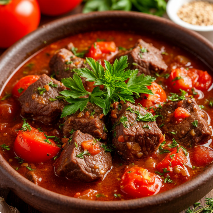 Приготовим сегодня ароматное и сытное чашушули по-грузински из говядины, блюдо, которое согреет душу в любую погоду! Начнем с подготовки ингредиентов: 350 г говядины нарезаем небольшими кубиками. 200 г репчатого лука нарезаем полукольцами. 350 г помидоров ошпариваем кипятком, снимаем кожицу и нарезаем кубиками. 1-2 болгарских перца нарезаем соломкой. Зелень (базилик и укроп по 30 г) мелко шинкуем. 3-4 зубчика чеснока измельчаем. В глубокой сковороде или кастрюле с толстым дном растапливаем 30 г сливочного масла. Обжариваем говядину до золотистого цвета. Добавляем лук и обжариваем до мягкости. Добавляем помидоры и тушим под крышкой около 15-20 минут, пока они не превратятся в соус. Добавляем болгарский перец, перемешиваем и тушим еще 5-7 минут. Добавляем измельченный чеснок и специи (например, хмели-сунели, кориандр, красный перец) по вкусу. Солим по вкусу. Тщательно перемешиваем и тушим под крышкой еще 10-15 минут, чтобы мясо стало мягким и нежным. В конце добавляем измельченную зелень